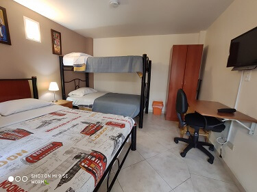 1 single bed and 1 bunk bed, closet, cable TV, bathroom inside with hot shower. Natural lighting and ventilation.